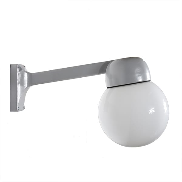 Denne funkisarmaturen har en retrostil som passer fra et gammelt hus til hus i moderne eller funkis-stil. Armen er 28 cm ut fra veggen. Det runde glasset er 15 cm i diameter. Enkeltglasset er 10 cm i diameter.