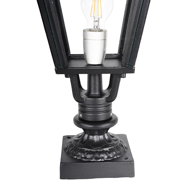 Vi har klassisk innkjørselsbelysning både i det lettere støpematerialet aluminium og i det robuste, tyngre materialet støpejern. Denne belysningen er håndstøpt i solid aluminium, noe som gjør den enkel å montere. Den slitesterke pulverlakkeringen i en moderne svart matt farge gjør at den har svært god beskyttelse, og det faktum at den er vedlikeholdsfri er noe mange liker, i tillegg til at denne portlampen ikke ruster. Glasset er ekte og gir et fint lys i mørket ved inngangen eller på portstolpen. En ekte klassiker som tåler tidens tann! Lampen har IP-nummer 23 og er CE-merket. Lampesokkelen er i porselen og har E27-fatning.