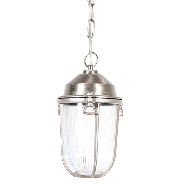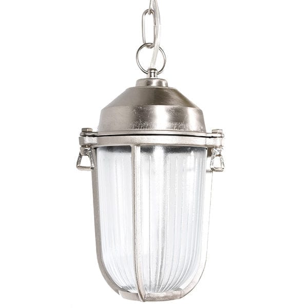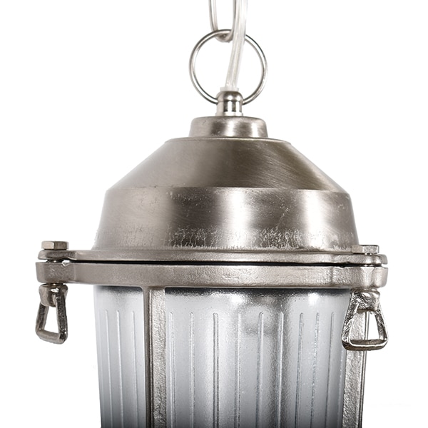 Vakker hengende taklampe i marin stil. Manacor er laget av messing som er matt forniklet, og har et klart glass. Den er godt laget og er en utrolig holdbar taklampe siden den er laget av et så solid materiale. Kjedet er 70 cm langt, og selve lampen er 22,5 cm. Lampen har et dekorativt kjede og en mutter som du skrur fast gitteret som holder det vakre glasset oppe. Denne taklampen er vakker i et uterom, på verandaen eller kanskje utekjøkkenet. Taklampen har IP 64