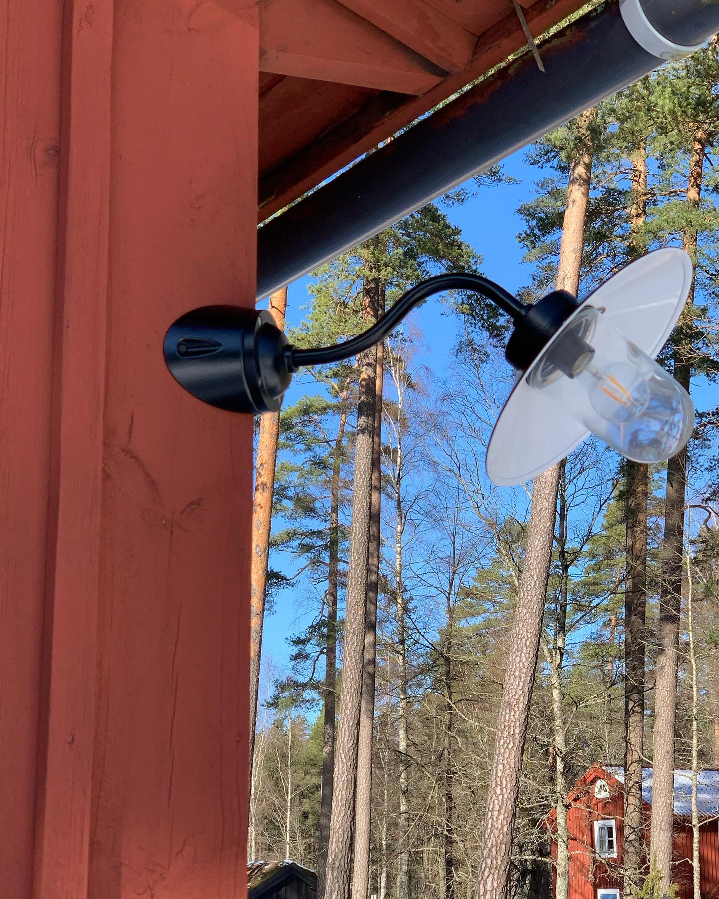 Det er vi i Kulturlampan som har designet denne stallampen. Solide støpte braketter i aluminium pulverlakkert 2 ganger. Skjerm med hvit reflektor for vakker lysspredning.