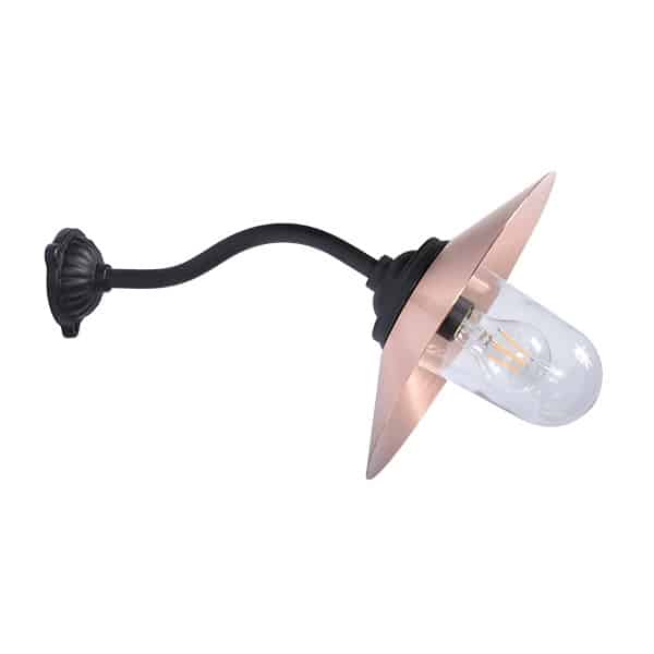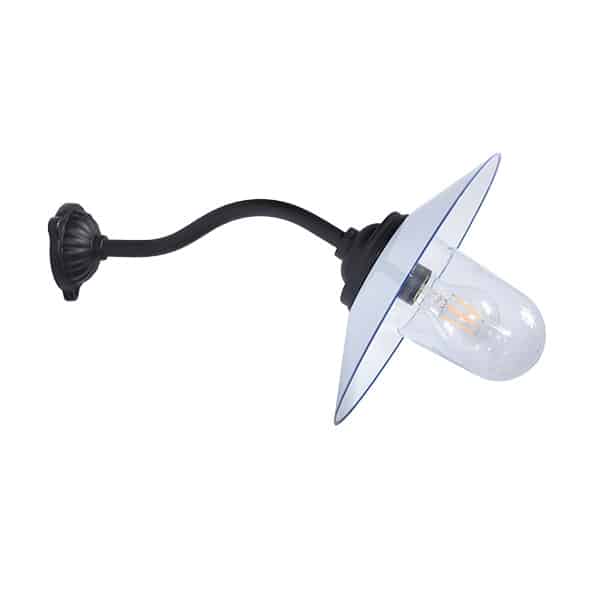 Lanterne i støpejern med skjermer i emalje og kobber. Den hvite skjermen har hvit emalje med mørkeblå striper. De svarte har hvit bakside med en svart stripe. Kobberskjermen er polert og ikke behandlet. Laget etter en gammel modell fra 1900-tallet. Vanlig utelampe i Sverige og Europa i denne tidsperioden, en av de vanligste. IP44 CE-merket og jordet.