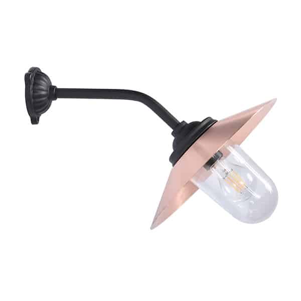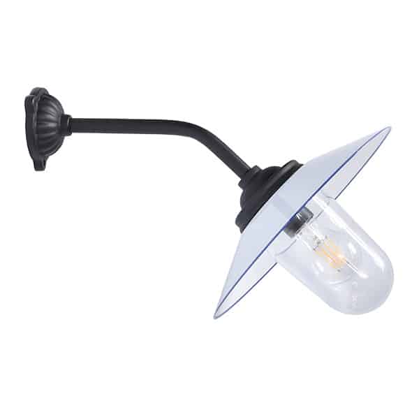 Lanterne i støpejern med skjermer i emalje og kobber. Den hvite skjermen har hvit emalje med mørkeblå striper. De svarte har hvit bakside med en svart stripe. Kobberskjermen er polert og ikke behandlet. Laget etter en gammel modell fra 1900-tallet. Vanlig utelampe i Sverige og Europa i denne tidsperioden, en av de vanligste. IP44 CE-merket og jordet.
