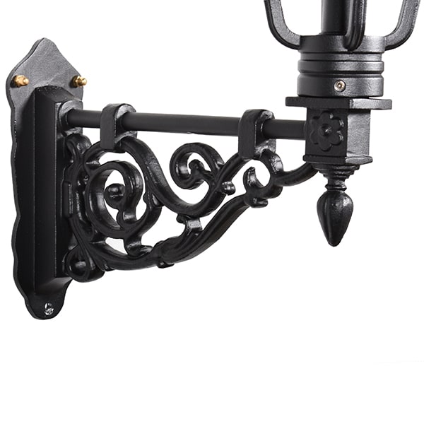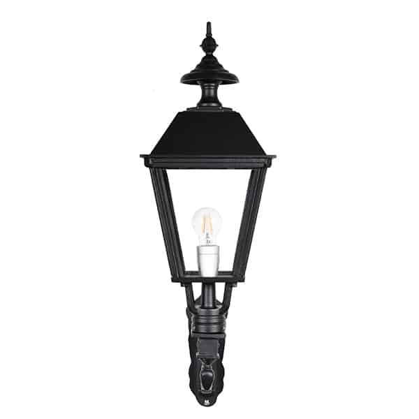 Utendørslampen er laget av solid håndstøpt aluminium, noe som gjør den enkel å montere på veggen. Vegglykten er pulverlakkert to ganger for best mulig beskyttelse, med en matt svart strukturfarge som gir en gammeldags, ekte følelse. Vegglampen er populær fordi materialet ikke ruster, og fordi den er så vedlikeholdsfri - en armatur for generasjoner!